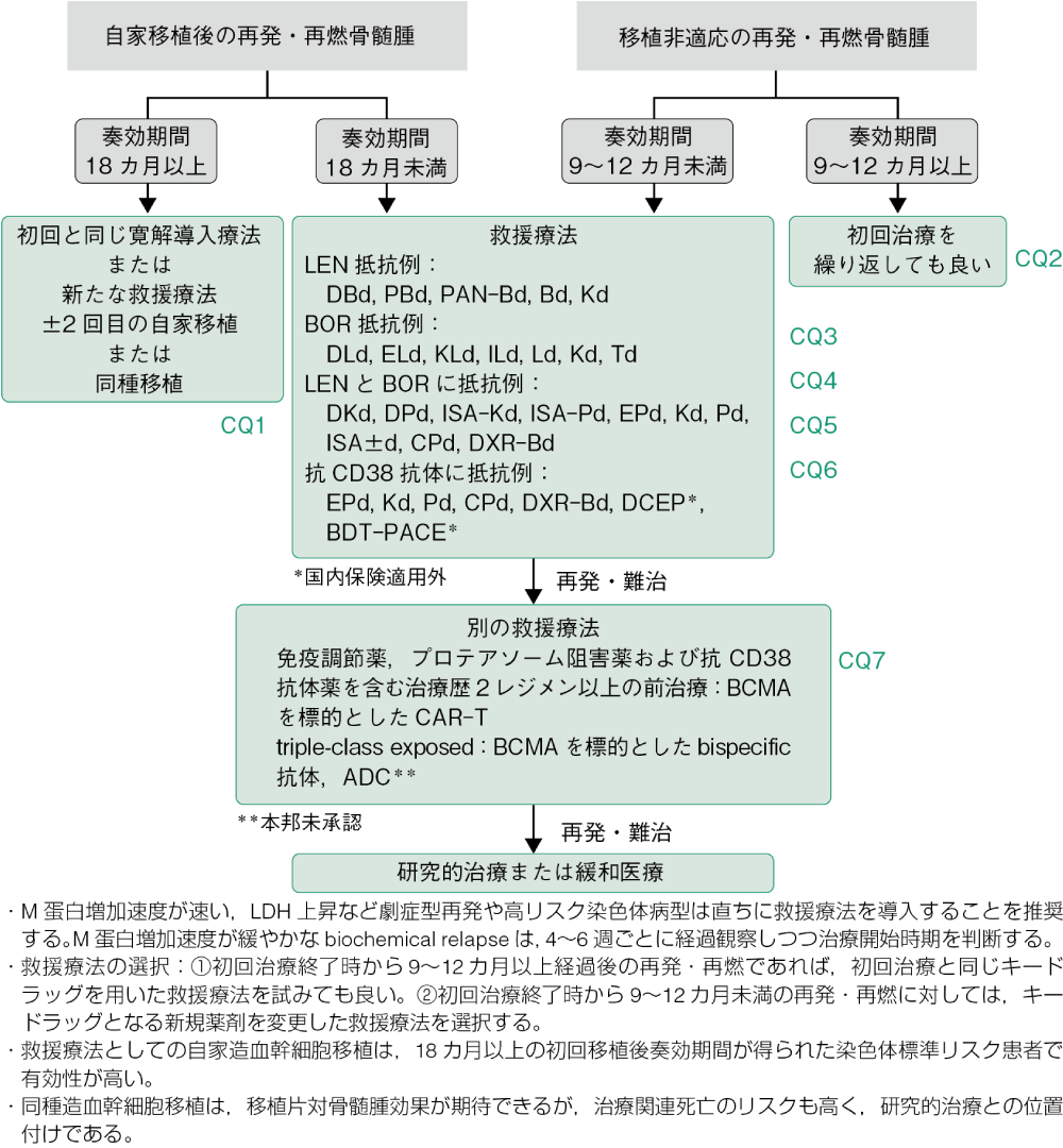 移植適応のある65歳未満の患者においては,救援療法が奏効した場合には2回目の自家造血幹細胞移植併用の大量MEL療法を行うという選択もあり,特に染色体標準リスクで初回移植後に18カ月以上の長期の奏効期間を示した患者で有効性が高い(再発・難治性骨髄腫:CQ1,エビデンスレベル1iiDiii)。同様に救援療法が奏効してHLA適合ドナーがいる場合には,同種造血幹細胞移植という選択肢もあるが,移植後早期の死亡率が高く再発・再燃も高頻度であることから,臨床試験の範疇で行われることが望ましい(再発・難治性骨髄腫:CQ1)。