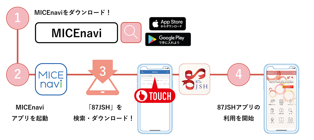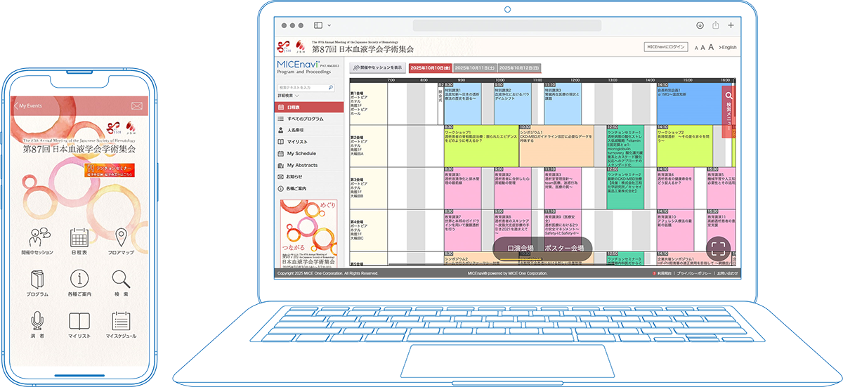 - MICEnavi内で「第87回日本血液学会学術集会」「JSH87」と検索し、プログラム情報をダウンロードしてください。