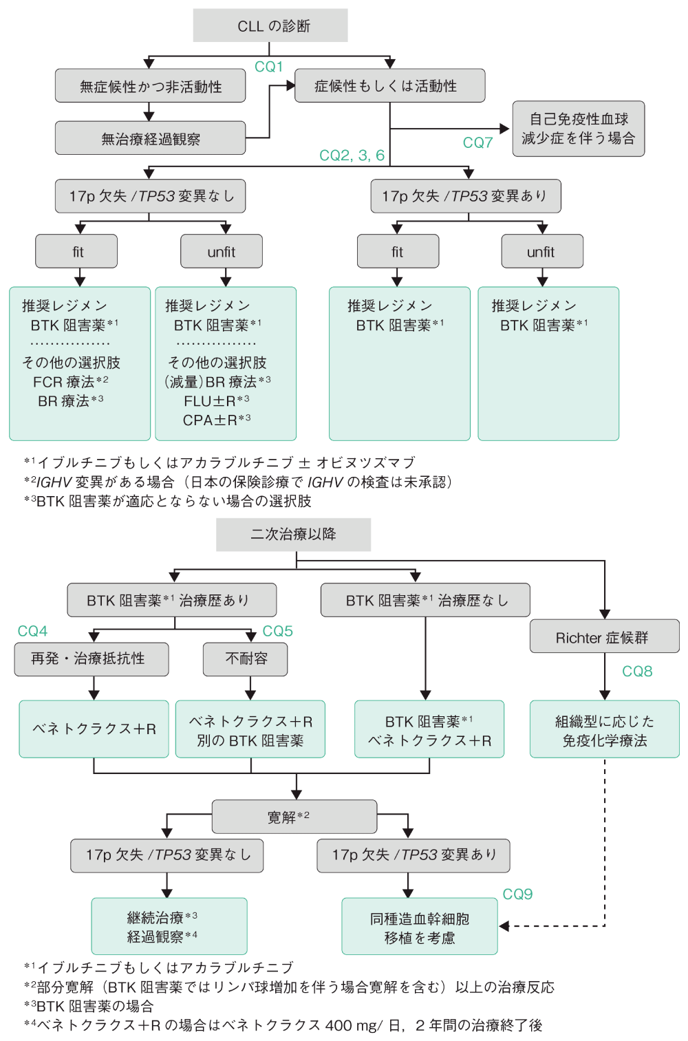 治療レジメンは,CLLの特徴および患者の状態を考慮して選択する。17p欠失やTP53変異をもつCLLは,抗がん薬や抗CD20抗体薬治療に抵抗性である(CQ3,6)。高齢者や全身状態が悪い,あるいは高齢者機能評価に問題があるunfitな患者は,標準治療を行うと治療関連毒性が強く現れる危険性が高い。そのため従来は染色体/遺伝子異常,年齢,全身状態,高齢者機能評価に基づいて治療法が層別化されていた。しかし,BTK阻害薬は17p欠失もしくはTP53変異を認めるCLL患者にも有効で,高齢者でも優れた効果と高い忍容性が得られることが臨床試験で示され,染色体/遺伝子異常や年齢にかかわらず初回治療としてBTK阻害薬が推奨されるようになった(CQ2)。frailな患者は,BSCの選択を含めて対応を検討する。