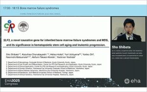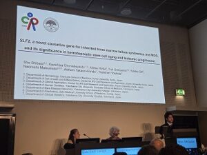 私の発表に関しては、先天性骨髄不全症候群、そして骨髄異形成症候群に進展しうる新規の胚細胞遺伝子変異を報告した内容で、この遺伝子がそれらを引き起こすメカニズムをiPS細胞などを用いて解明した研究になります。原因不明の血液学的異常を呈している子供達の中にこの変異をもっている患者が存在していると考えられ、これらの知見を広め、血液疾患としての疾患概念を新たに確立し正確な診断に繋げる事、そして治療へと展開する事が私の研究の目標であります。